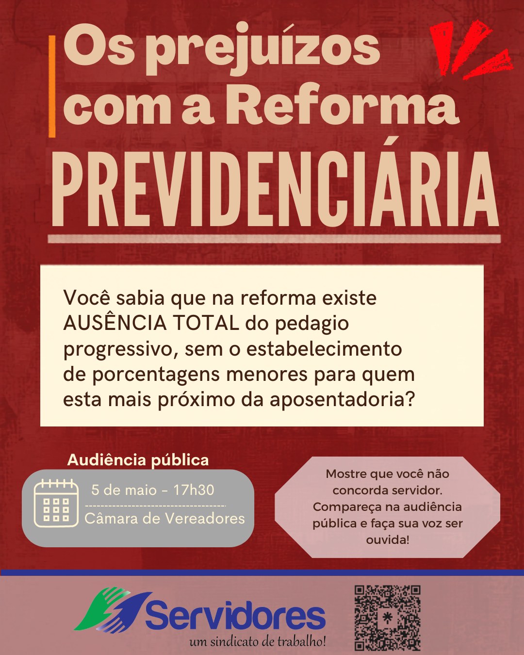 Teremos na próxima segunda-feira, 5 de maio, mais uma audiência para tratar sobre a Reforma Previdenciária. Será a partir das 17h30, na Câmara de Vereadores.